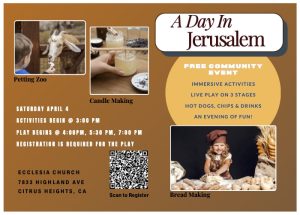 Free event! Arrive an hour before your play time to enjoy a day in the town of Jerusalem with fun activities planned for you!